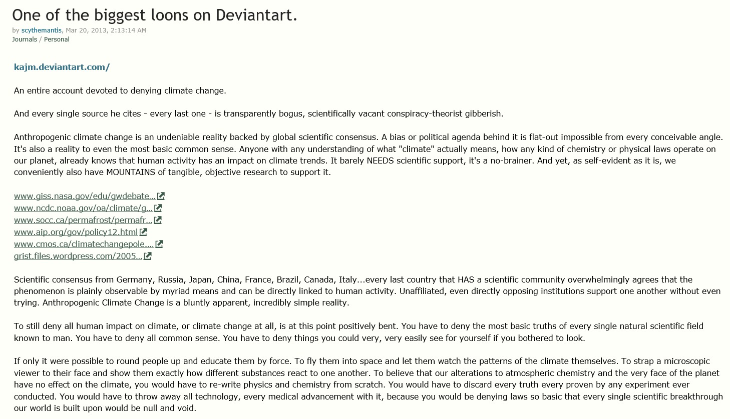 And here is the first of those journals. Note that in the final paragraph, scythe chooses to LIE about every single thing skeptics believe or think: